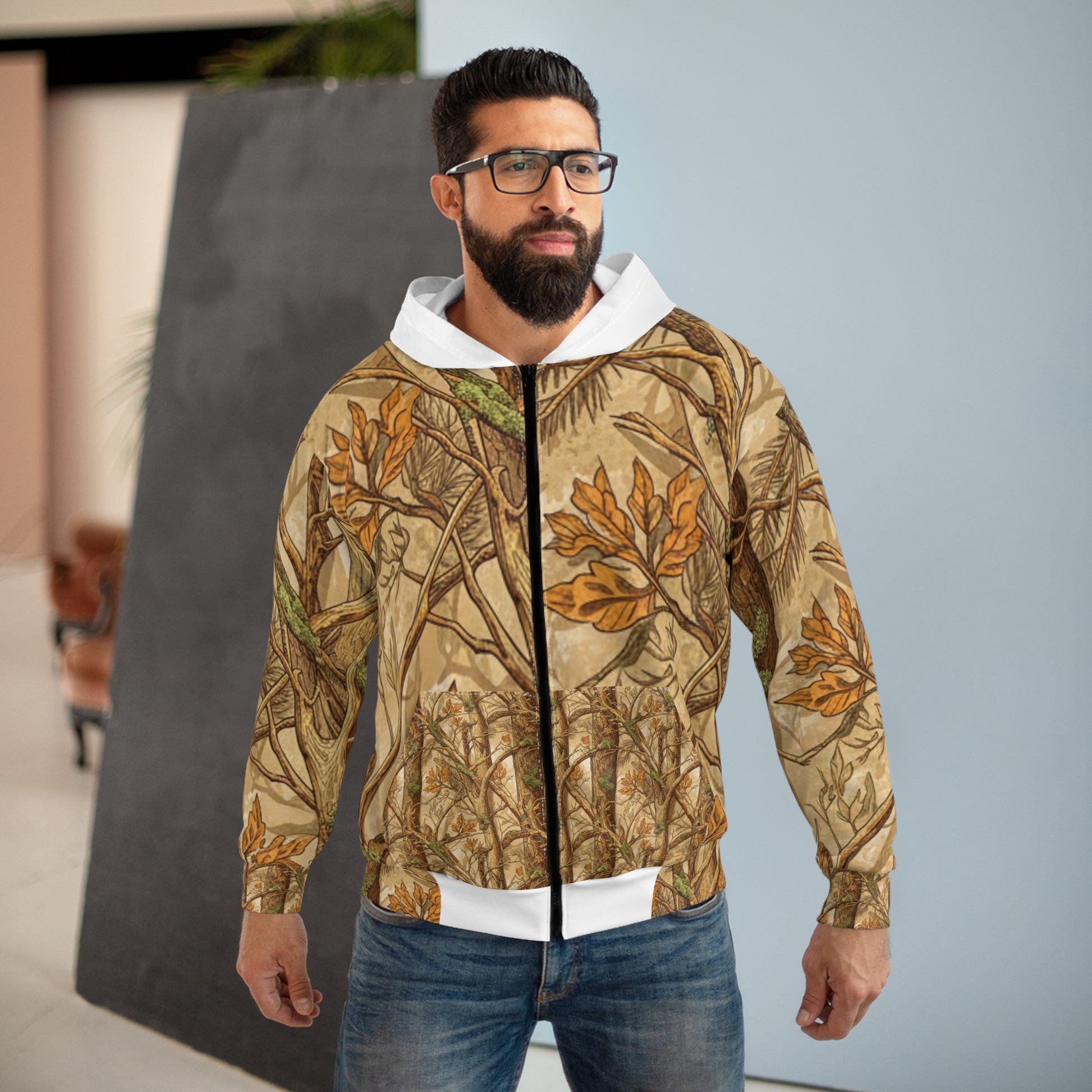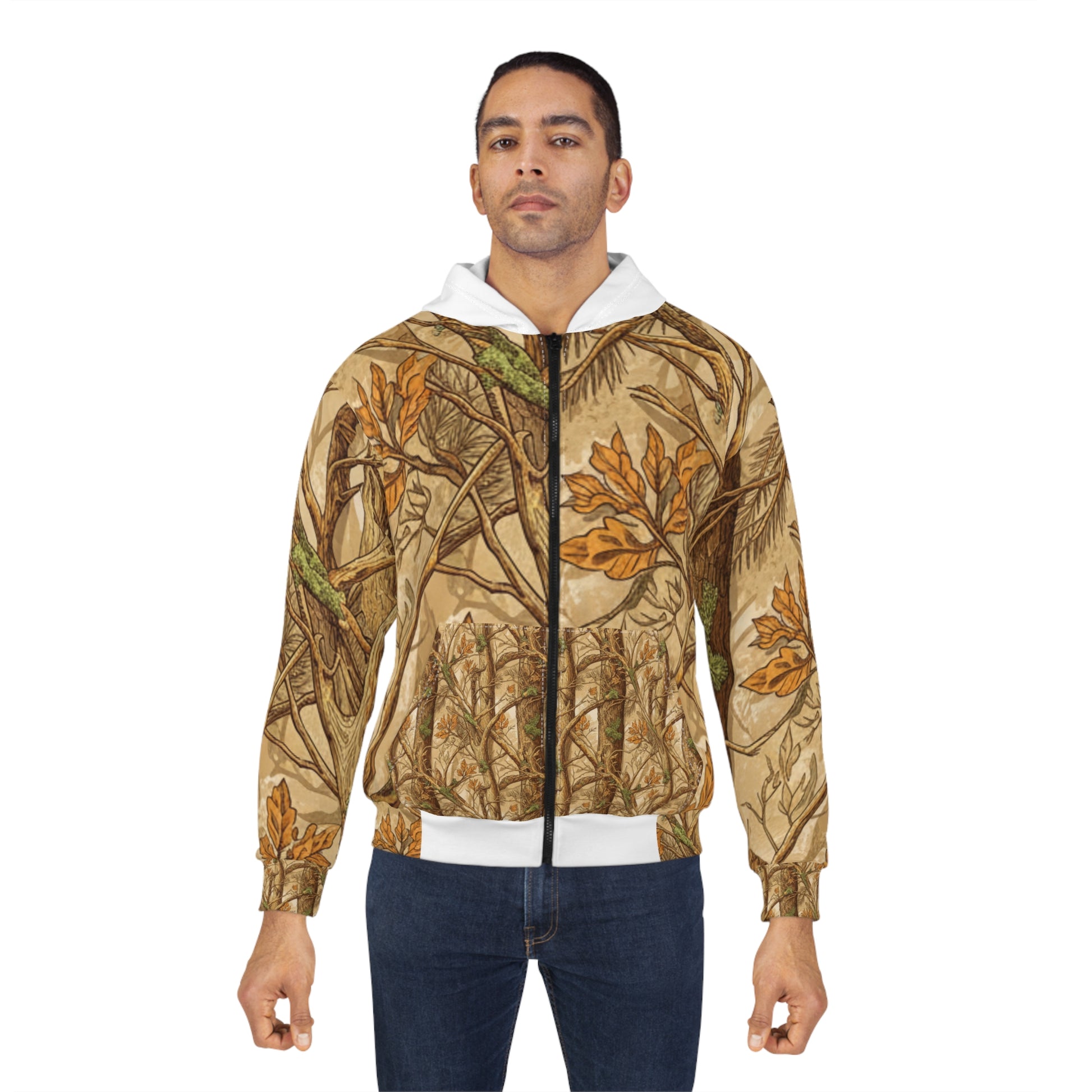 This zip-up hoodie wraps you in a quiet, woodsy calm. The all-over camouflage of twigs, oak leaves, and lichen feels like a walk through a late-autumn forest — muted browns, warm ochres, and mossy greens that blend into the background while still showing texture up close. A clean white cross on the back adds a subtle faith-forward statement, simple and grounded against the natural pattern. The fitted hood and roomy pockets make it easy to slip on for a chilly morning coffee run, a slow hike, or a Sunday gathering at a cabin. It wears like a familiar layer — practical, comfortable, and quietly expressive of an outdoors-centered, faith-minded life.