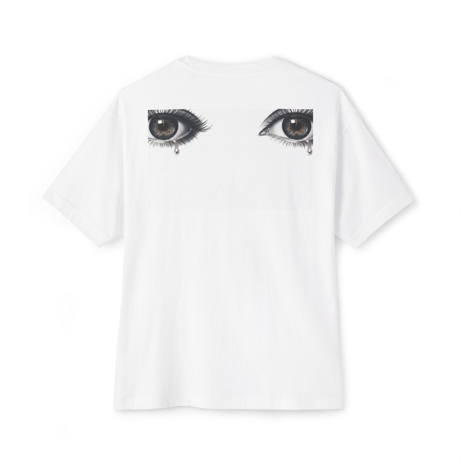 A relaxed, oversized tee with quiet, expressive artwork — a small palm-stop emblem over the heart and soulful, teary eyes across the upper back. The soft, medium-weight cotton drapes loosely, offering casual comfort with a laid-back, artsy edge. Wear it with high-waist jeans, layered under an open flannel, or alone when you want your outfit to whisper emotion rather than shout. The front’s palm symbol reads like a gentle halt—personal boundary, inner pause—while the back’s detailed eyes hold a story, lending a vulnerable, thoughtful mood to everyday wear. This tee sits in the wardrobe as a wearable pause: calm, contemplative, and quietly bold.